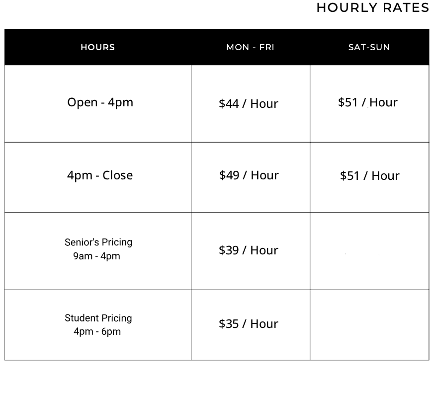 Our 4 bays are rented by the hour, so whether you play by yourself or play as a group you'll pay the same low hourly rate!